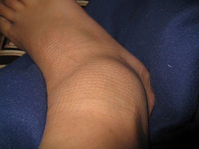 anyhow, i’ve been huddled up on my couch ever since praying the throbbing would stop. this sucks…i had so much to do and now I’m laid out. sucks. well, miles wanted a picture. just a little swollen – no bruising like Miles’ monster. eew. i don’t think he heard of ice. good thing I shaved my legs this morning or this photo wouldn’t exist.