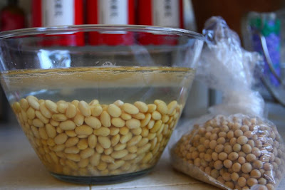 Soybeans soaking in water overnight – see how big they get compared to the dry soybeans