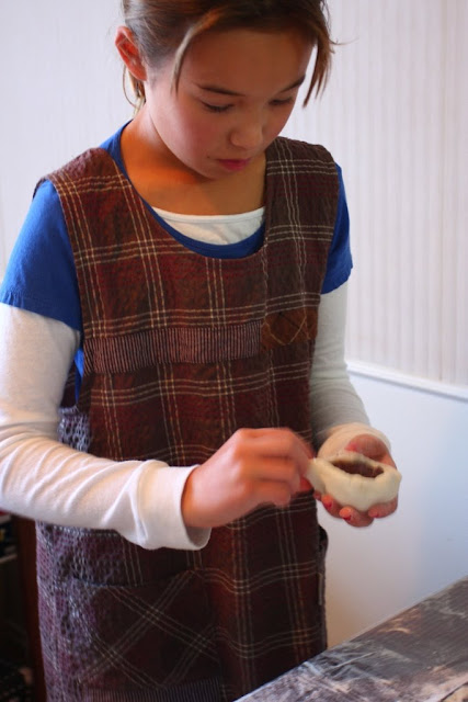 Step 6: take mochi and start pulling from outside edges, leaving the center are thicker than the edges. Burn fingers on the heat of the mochi, playing hot potato with it. The mochi is hot but still stretchable while it is hot…once it cools down it’s a lot harder and stickier to work with.