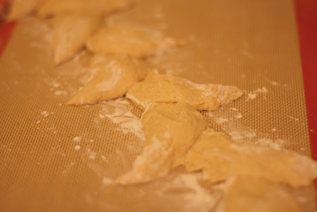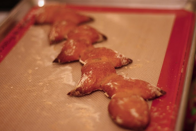 As i waited for the Epi to bake, I decided to start on my spicy chips. I began rolling out the dough. I was completely baffled by how I could best combat the stickiness and wetness of the dough. I ended up dusting on enough flour to build a small child. From scratch. I grumbled, I growled, and I rolled. After I brushed on the oil, I started sprinkling the chili powder on little by little, using all but a teeeny weeeny bit. I looked down and realized that it was on a bit thick.