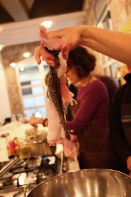 I don’t like to feel useless, especially when someone else is bustling around in a busy fashion around the kitchen. So, I volunteered to help out by unpacking our goods from the boqueria. Luckily, that earned me the right to make the fish stock! I quietly diced my veggies and the monkfish [ugh…most disgusting fish EVER…and I don’t care that it’s “good eats”] off to the side while she started on the Crema Catalan [very much like a creme brulee].