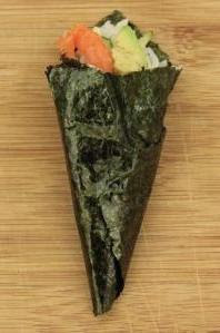 6.) Continue to roll around making a cone. At the end of the roll, there will be a little left over. To seal the temaki, smash rice on nori